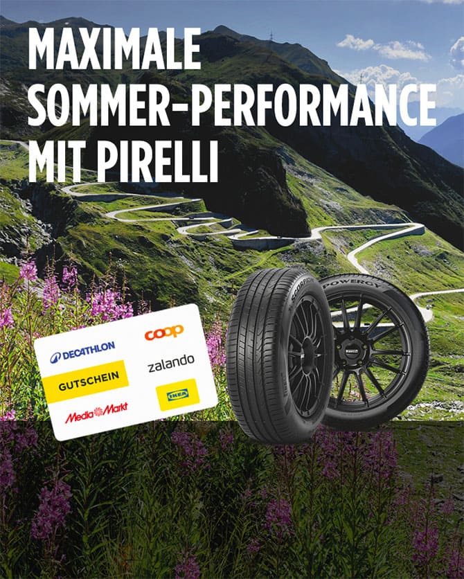 Beim Kauf von vier neuen PIRELLI Sommer- oder Ganzjahresreifen ab 18 Zoll für PKW oder SUV im Zeitraum vom 9. März bis 31. Mai 2026 bei einem teilnehmenden Händler erhalten Sie eine von fünf attraktiven Wunschprämien.